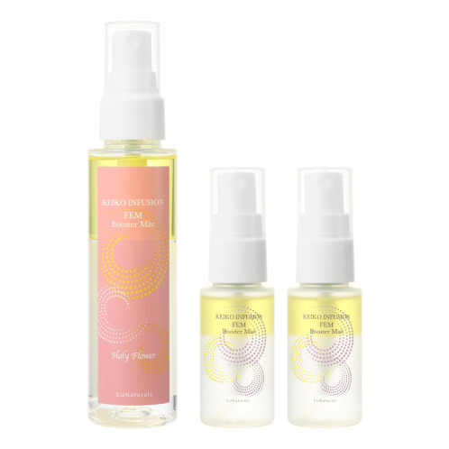 <サンナチュラルズ>より、デリケートゾーンケアもできる二層式の「KEIKOインフュージョン フェムブースターミスト(ボディー用ミスト化粧水)」30ml×2、「KEIKOインフュージョン フェムブースターミストホーリーフラワー(ボディー用ミスト化粧水)」100mlサイズのセットです。