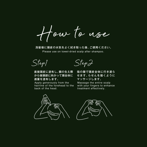 洗髪後に15秒の簡単マッサージで頭皮ケアが行えます。女性も手に取りやすいよう、化粧水のようなスタイリッシュなデザインです。香りにもこだわり、ひと塗りした瞬間、フレッシュなシトラスの爽やかさがスーッと広がり、やさしく落ち着いた印象のムスクがふわっと包み込みます。