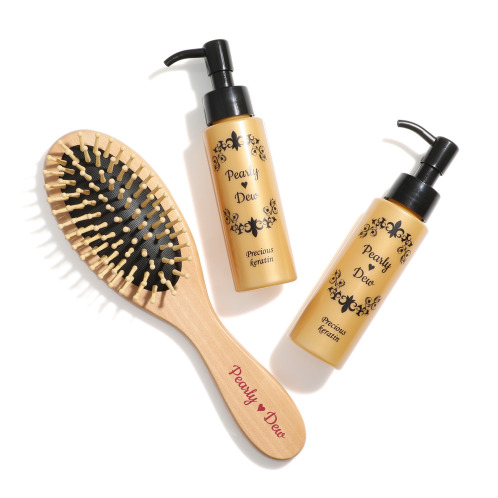<パーリーデュー>より、根元から毛先に向かって塗布することで、ダメージを受けたキューティクルを補修し、軽やかでハリ・ツヤのある髪へと導く美容ヘアオイル2本、ヘアブラシ(巾着袋付き)のセットです。