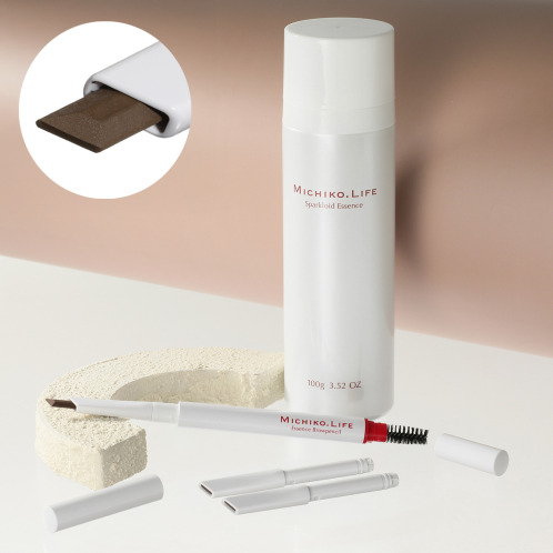 <ミチコドットライフ>より、ブラシとシャープナーが付いたアイブロウペンシルとそのレフィル(詰替え用)×2、炭酸ガス(二酸化炭素)を配合した泡状美容液のセットです。