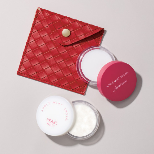 <アップルミントシュガー>より、ウッディでミルキーな香りの「フレグランスクリーム フィグミラクル(練り香水)」、やさしいホワイトティーの香りの「フレグランスクリーム パール No.10(練り香水)」、ケースのセットです。