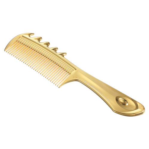 頭皮を刺激するように使用することができる、カッサブレードが一体した「ラブクロム K24 PG スカルプカッサ <ゴールド>」のご紹介です。特殊表面加工により、従来のコーミングで髪のダメージの原因となっていた摩擦を抑え、静電気を拡散し、日々のお手入れでツヤ髪へ導きます。カッサ部分は表面特殊加工の滑らかな刃先が、やさしく頭皮を捉え、頭皮の毛穴につまった汚れを物理的に掻き出します。また、指圧代用器として頭部の血行を良くし、筋肉のこりをほぐします。インバス時を含め濡れ髪にも使用可能で、トリートメント時にも使用可能です。24金(純金)コートをほどこすことで、櫛通りがより滑らかに。ゴージャスな気分での毎日のヘアケアをお楽しみいただけます。