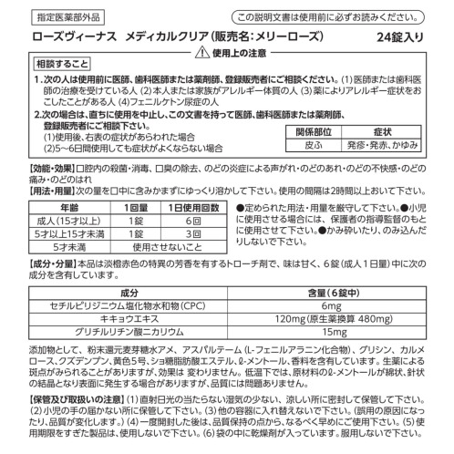 セチルピリジニウム塩化物水和物(CPC)、キキョウエキス、グリチルリチン酸二カリウムを配合し、口腔内の殺菌・消毒、口臭の除去、のどの炎症による声がれ・のどのあれ・のどの不快感・のどの痛み・のどのはれの効果・効能のある指定医薬部外品「ローズヴィーナス メディカルクリア(メリーローズ)」です。水なしでいつでもどこでもなめられるタブレット形状(※使用の間隔は2時間以上おいて下さい)。持ち運びにも便利です。