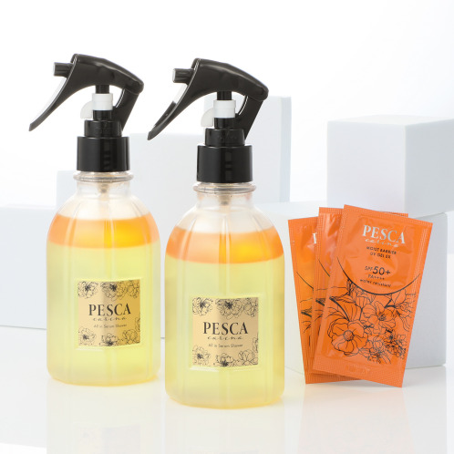 <ペスカ>より、シュッとひと吹きするだけで保湿のスキンケアが完結するオールインワン、全身に使える保湿美容液×2、日中用の美容液として、お肌に潤いを与え、みずみずしい素肌へ導き、紫外線からお肌を守る、SPF50+、PA++++、UV耐水性★★の日焼け止め・化粧下地・日中用美容液1回分×3のセットです。