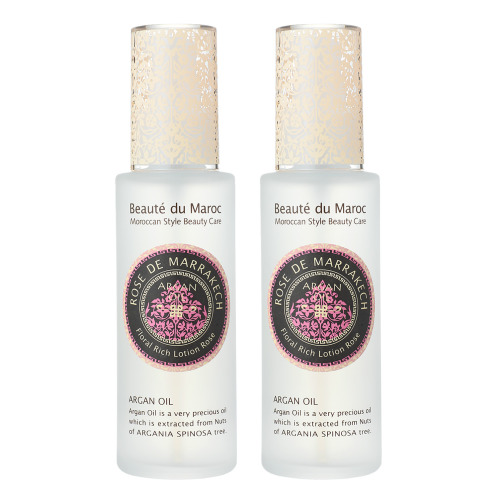 <ローズ・ド・マラケシュ>より、お肌を保湿するアルガンオイル(アルガニアスピノサ核油)とお肌に潤いを与えて、お肌を整えるバラ水(ダマスクバラ花水)を混ぜ合わせた美容水100ml×2のセットです。