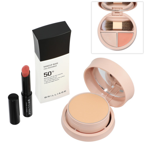 メイクの巨匠、メイクアップアーティスト嶋田ちあき氏プロデュースの<ブリリアージュ>より、SPF50+、PA++++のパウダリーファンデーション、チークコンシーラー、ハイライトを1つのコンパクトにセットしたマルチファンデーションパレット、軽やかに伸びるテクスチャーでサーッとなじんで、素肌の上に薄く透明なフィルムベールを形成したように毛穴や乱れたキメなどのお肌の凹凸をカバーしてつるりとなめらかなお肌に整えるSPF50+、PA++++のUV化粧下地・増量サイズ(55g)、濡れたようなみずみずしいツヤのある口元を演出するリップカラー(色:ライヴリーコーラル)のセットです。