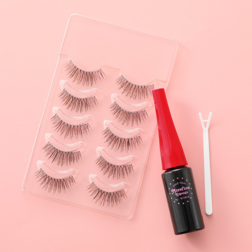 <モアフロウ>より、独自の成分配合とバランス配分にこだわって配合したゴムラテックス、(スチレン/アクリレーツ)コポリマーが人工的な疑似皮膜(物理的なメイクアップ効果)を形成し、明るく朗らかな印象の目元を演出する、特殊皮膜タイプのまぶた用化粧料と、補助スティック、黒と茶色をミックスした繊細な毛を採用し、自まつげと自然になじむつけまつげ・5ペア(10枚入り)のセットです。