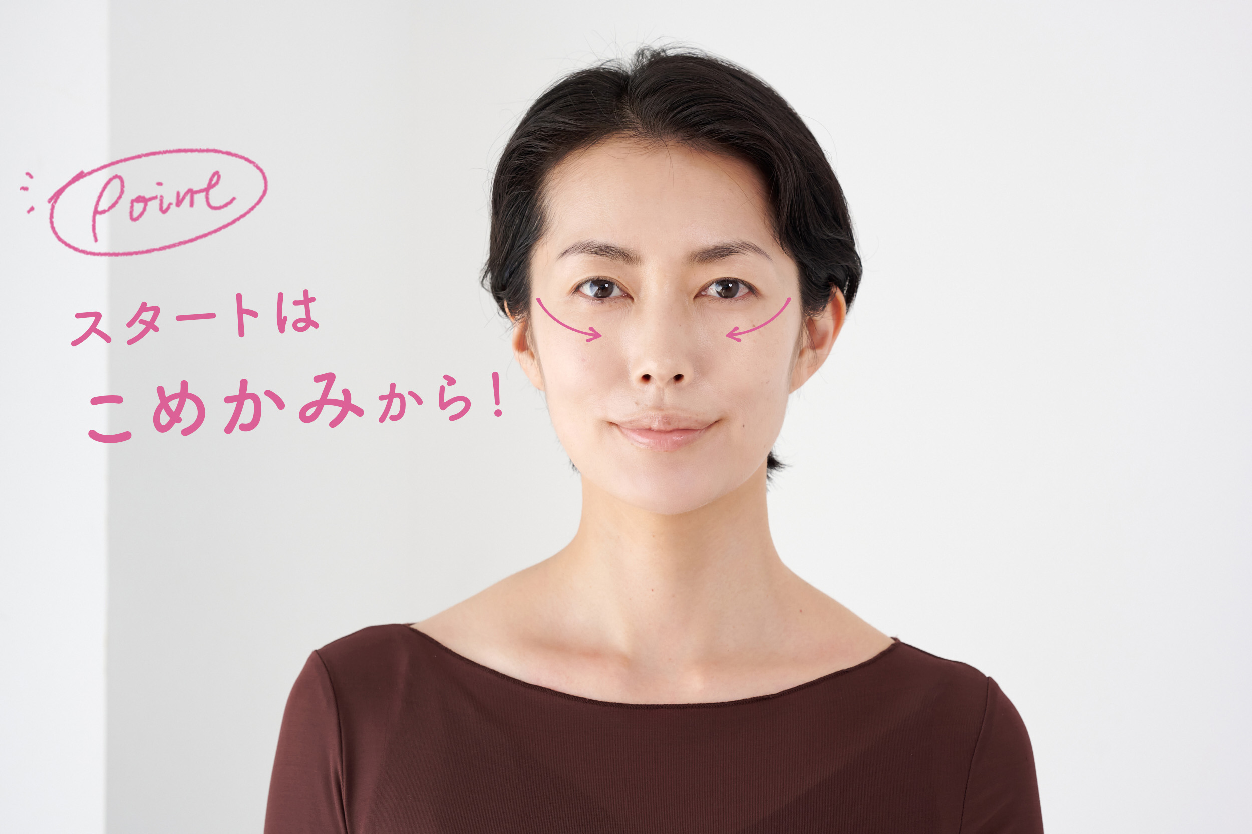 色づけるのは、こめかみ~頬の中央(黒目)の辺りまで。顔の内側に血色をのせると若作りな印象になりやすいので、顔の外側にふんわり、を心がけて。