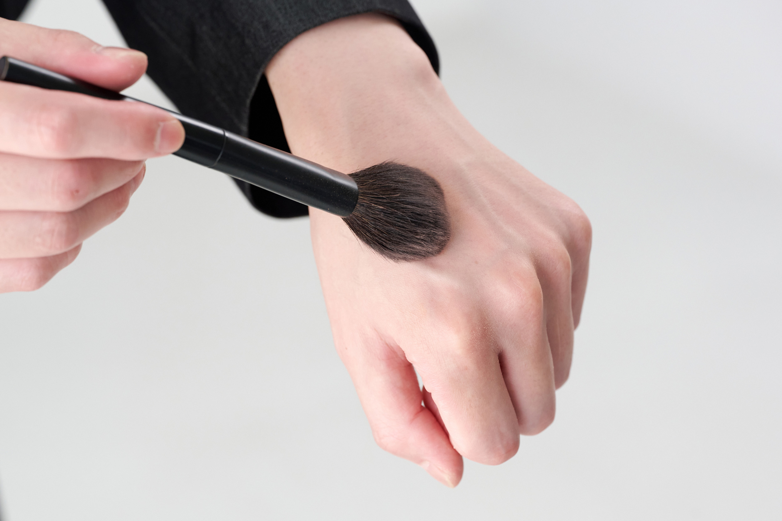 ①チークをブラシにたっぷり含ませたら、手の甲で粉を払う。ぼてっと濃くではなく、ふんわり薄膜にのせるために大切なステップ。
