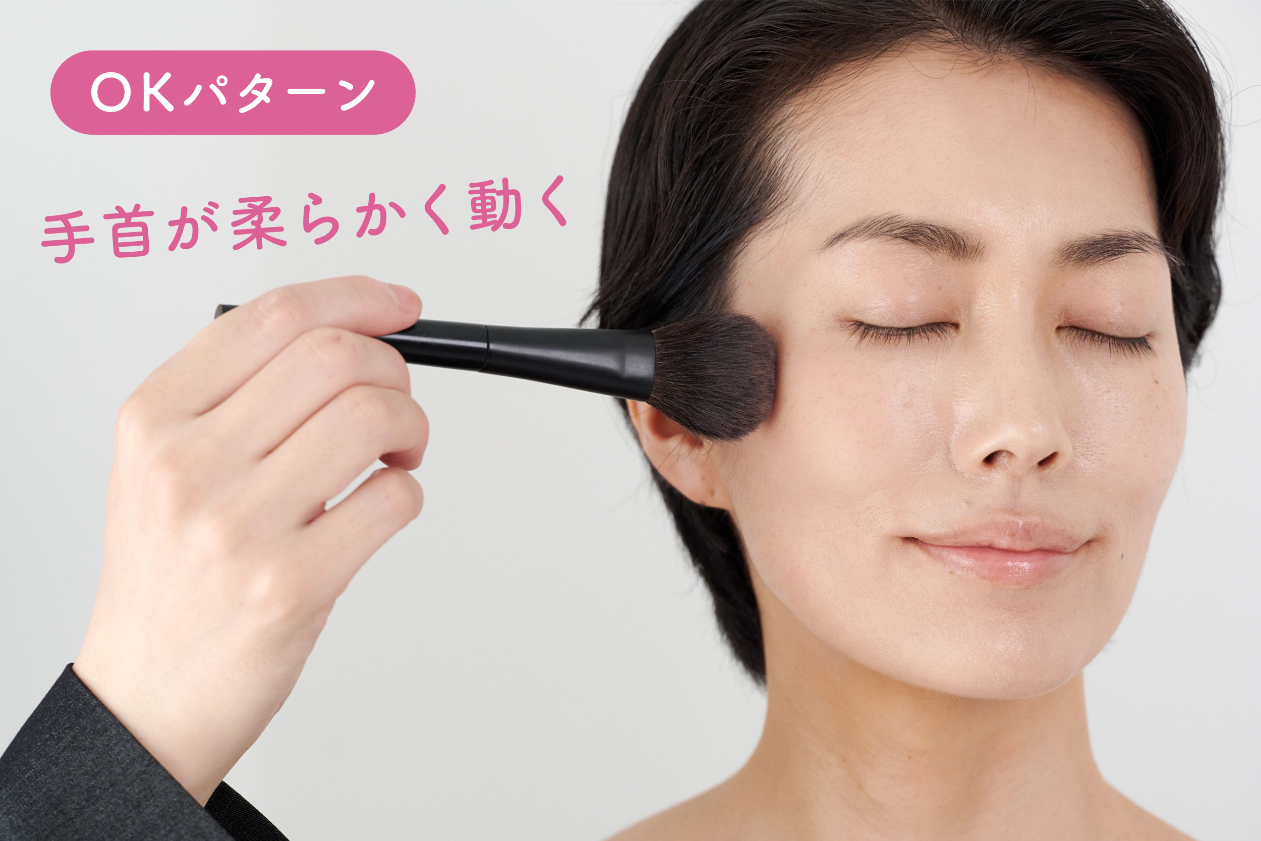 OK!→ブラシの上の方を持つことで手首を柔らかく動かすことができ、ふんわりとチークをのせられる。
