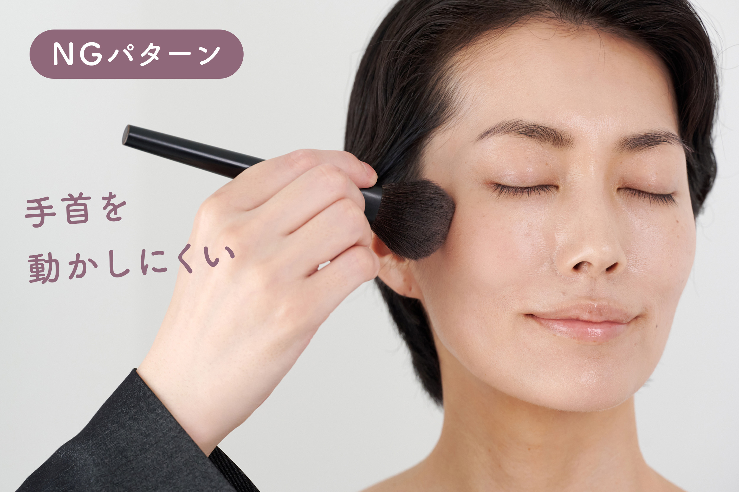 NG→ブラシの下の方を持つと、手首が固定されやすくチークがベタッと濃くついてしまう。