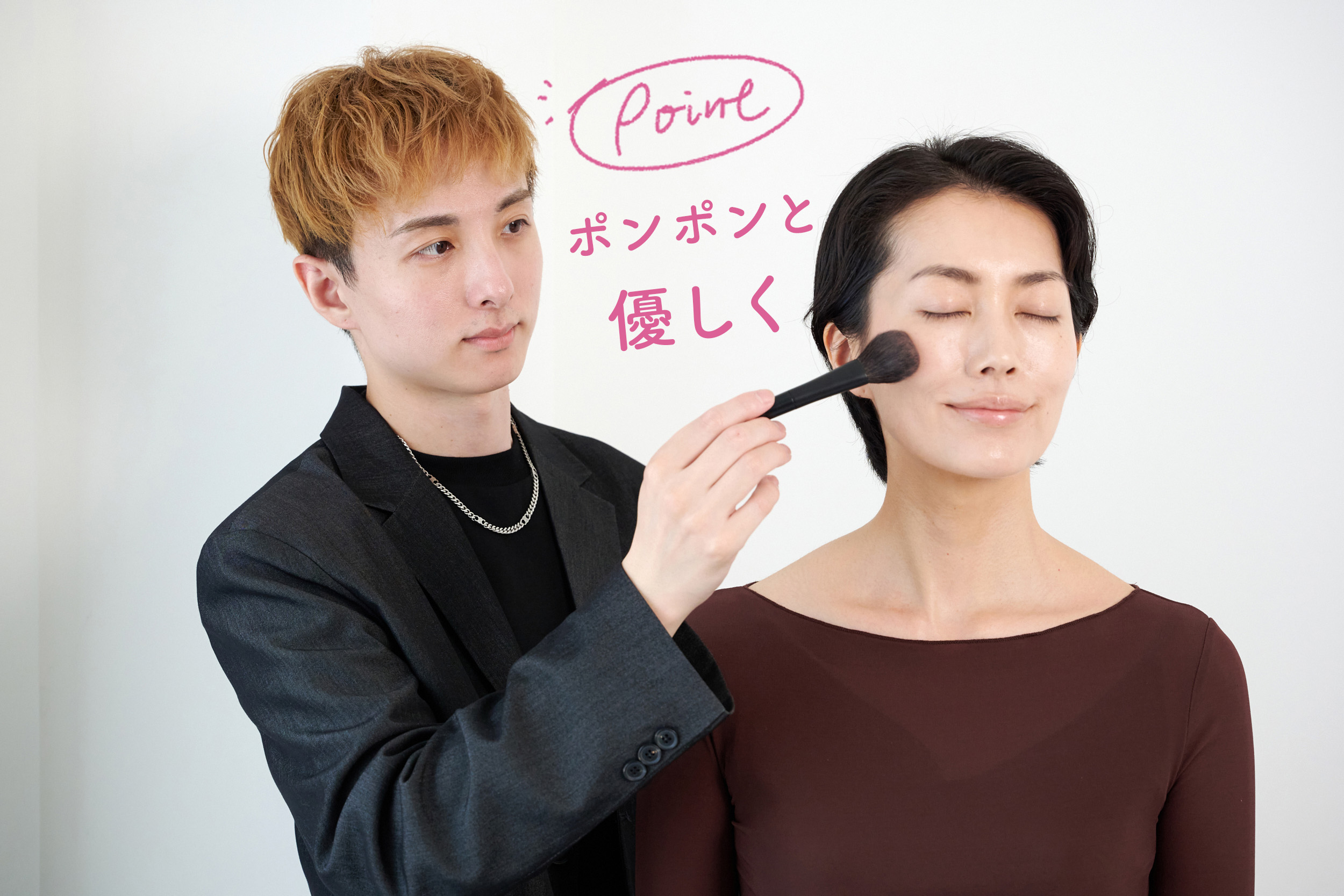 頬に淡い血色を宿すことで、肌のくすみも晴れて大人に似合うヘルシーなハッピーオーラが。こめかみ部分にも色をのせることで、正面だけでなく横顔も美しく。