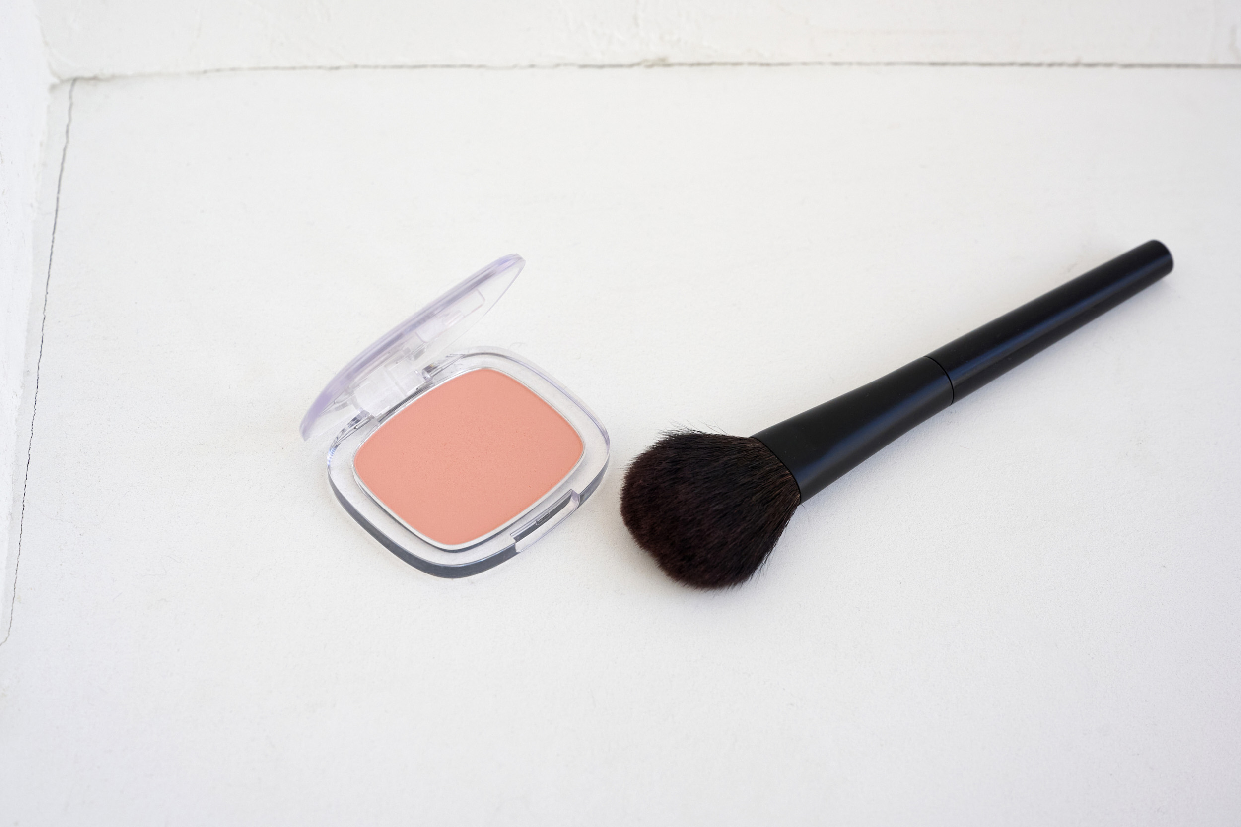 ピンクとオレンジの中間がベスト! ピンクは肌色によってはフェミニンになりすぎるし、オレンジはくすんでしまうことも。パール感が強すぎないものを選ぶとより肌になじみやすい。また、ブラシは柔らかな毛質のやや大きめブラシがふんわり、薄膜にチークをのせられるのでおすすめ。
