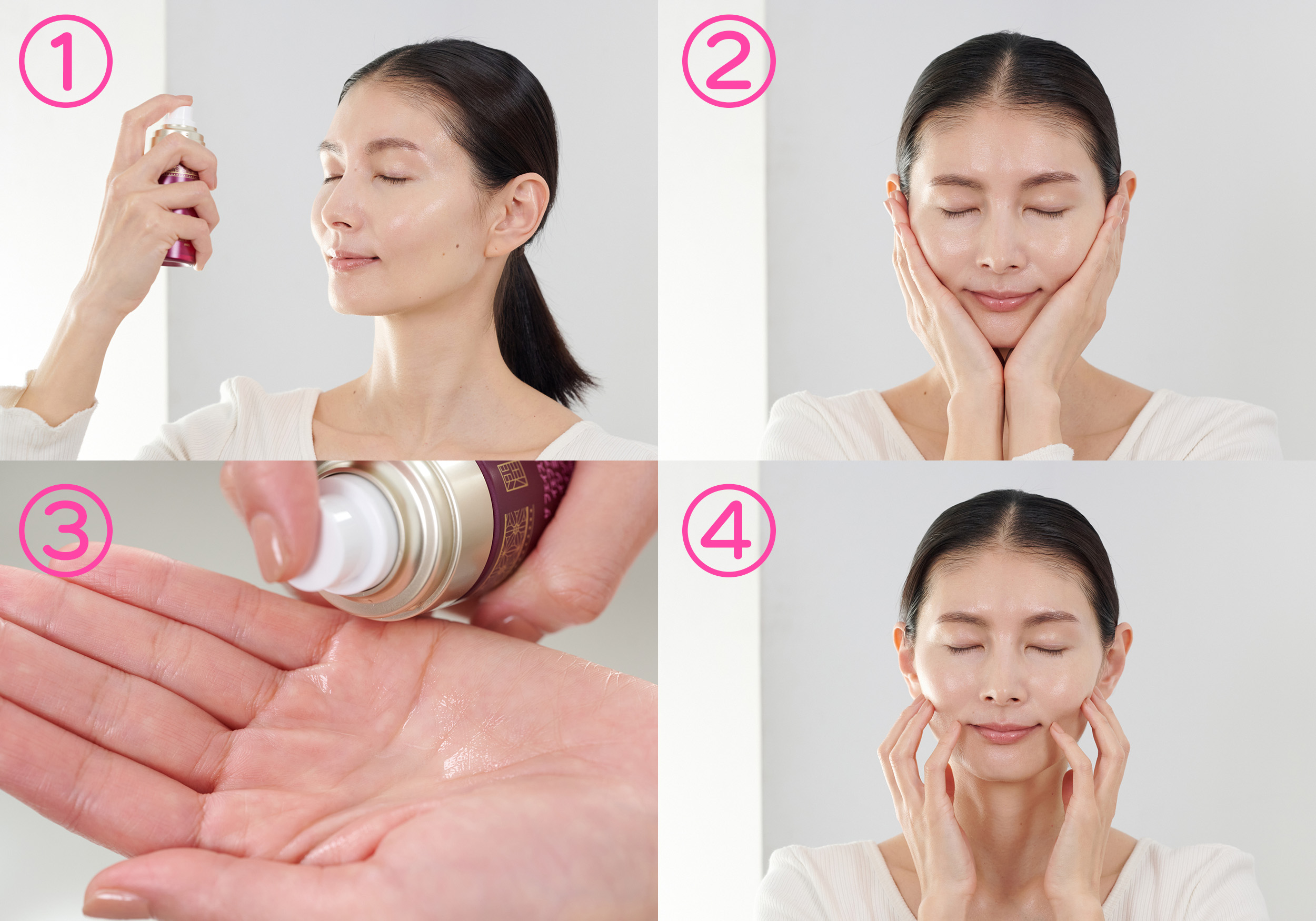 ①まず顔全体に規定量のミスト(普通の化粧水でも可)をオン。