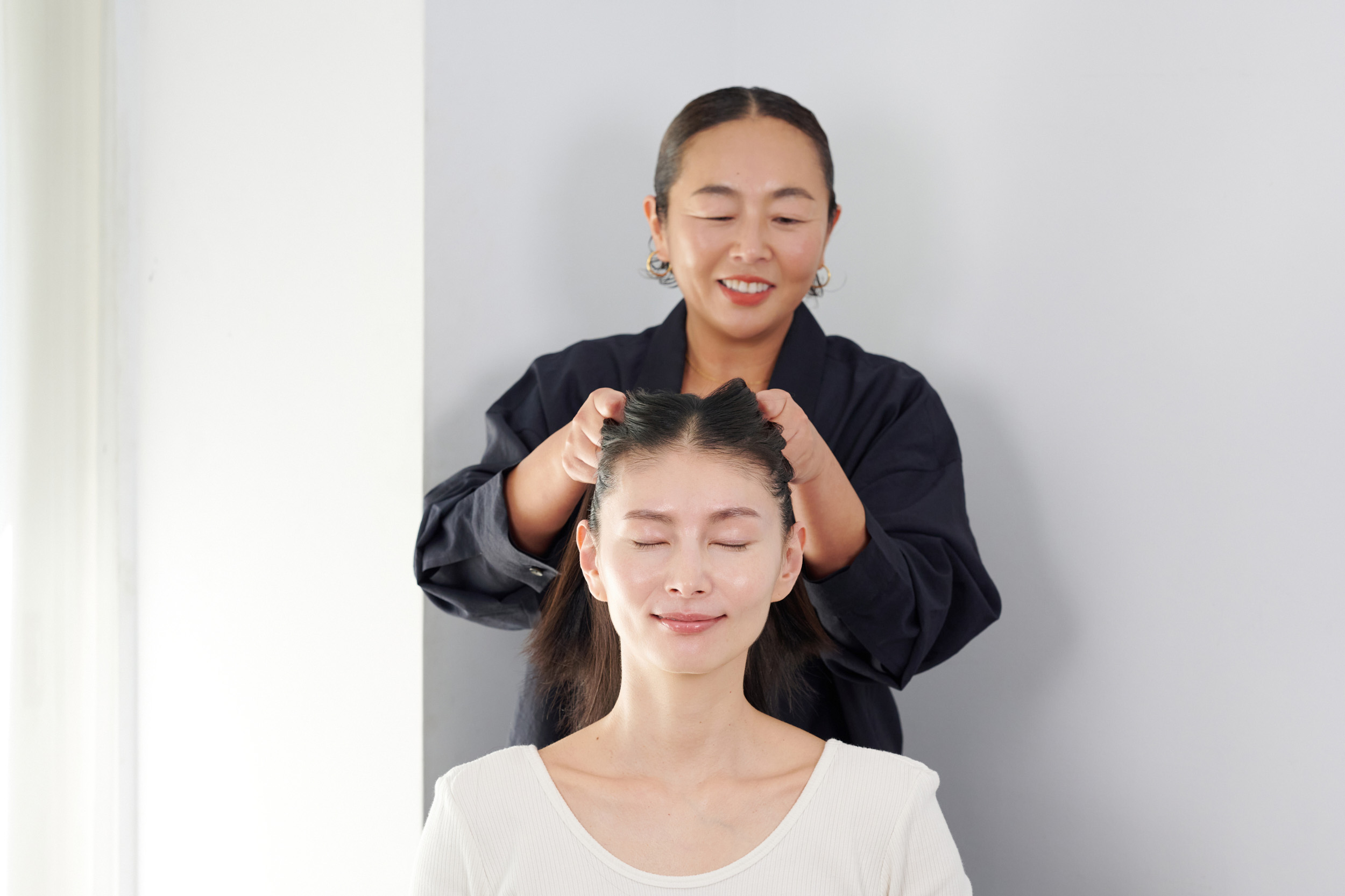 ①こめかみ~側頭部に親指以外の指先でグルグルと10回ほど円を描く。頭皮はこするのではなく、動くくらいしっかりと強めの圧をかけるのがポイント。
