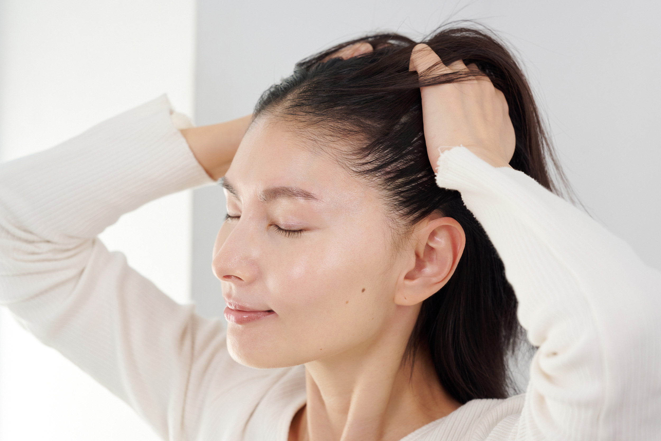 側頭部(耳より上)の髪の毛をつかみ、頭頂部でひとつにまとめてぎゅっと引っ張る。