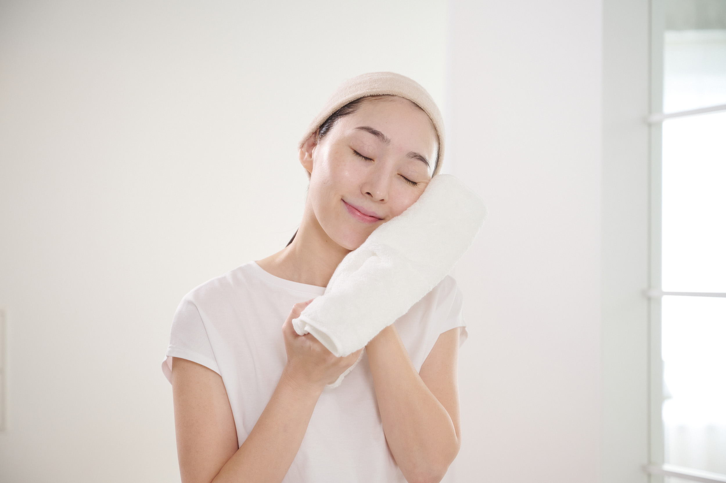 「タオルで水分を“拭き取る”のではなく、“吸い取る”。吸水性に優れ、肌あたりの柔らかなタオルを優しく肌に押し当てて水分をしっかり吸い取らせましょう」