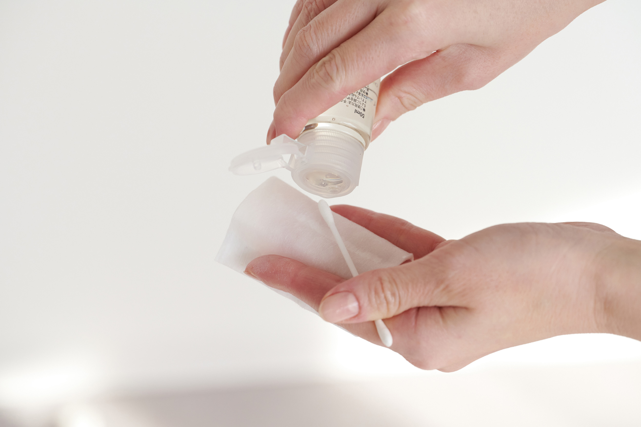 「ポイントメイクアップリムーバーの使用量をケチってはダメ!メイクをしっかり落とせないだけでなく、摩擦など刺激の原因にもなります。コットンにも綿棒にも、肌に当たる部分にたっぷり含ませましょう。また綿棒にリムーバーを含ませる際には、写真のようにマスカラオフに使うコットンの上で行うと無駄がありません」