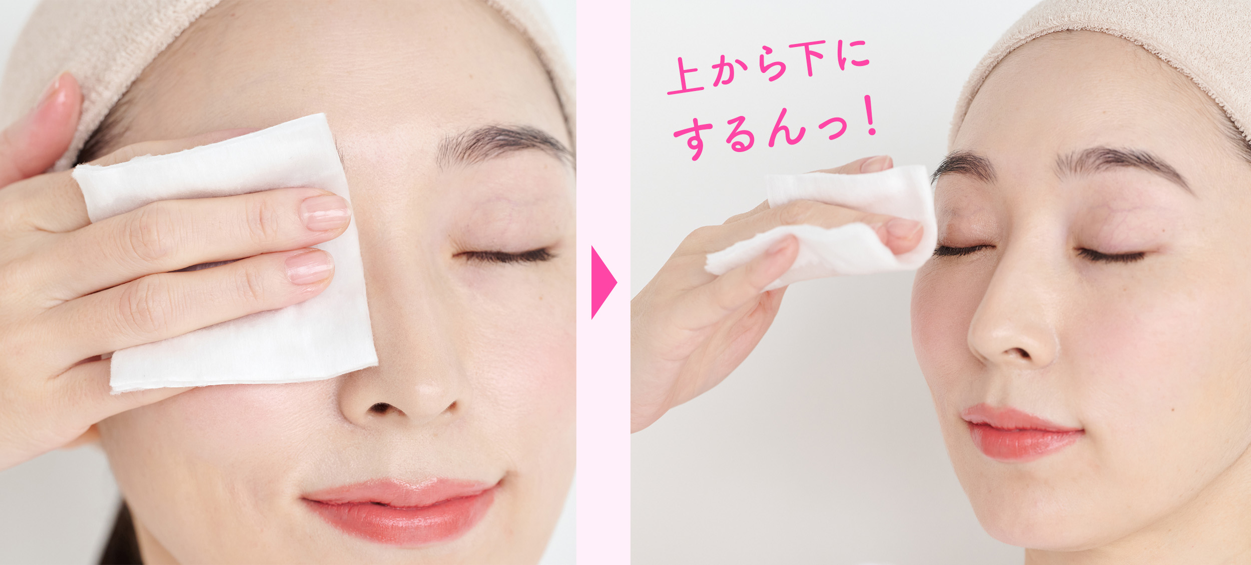 リムーバーをたっぷり含ませたコットンをまぶたの上に10秒ほど優しく押し当てて、マスカラやアイライナーなどを浮かせる。そのまま下方向に“するん!”とスライドさせて、シャドウ、マスカラ、アイライナーなどを軽くオフしておく。
