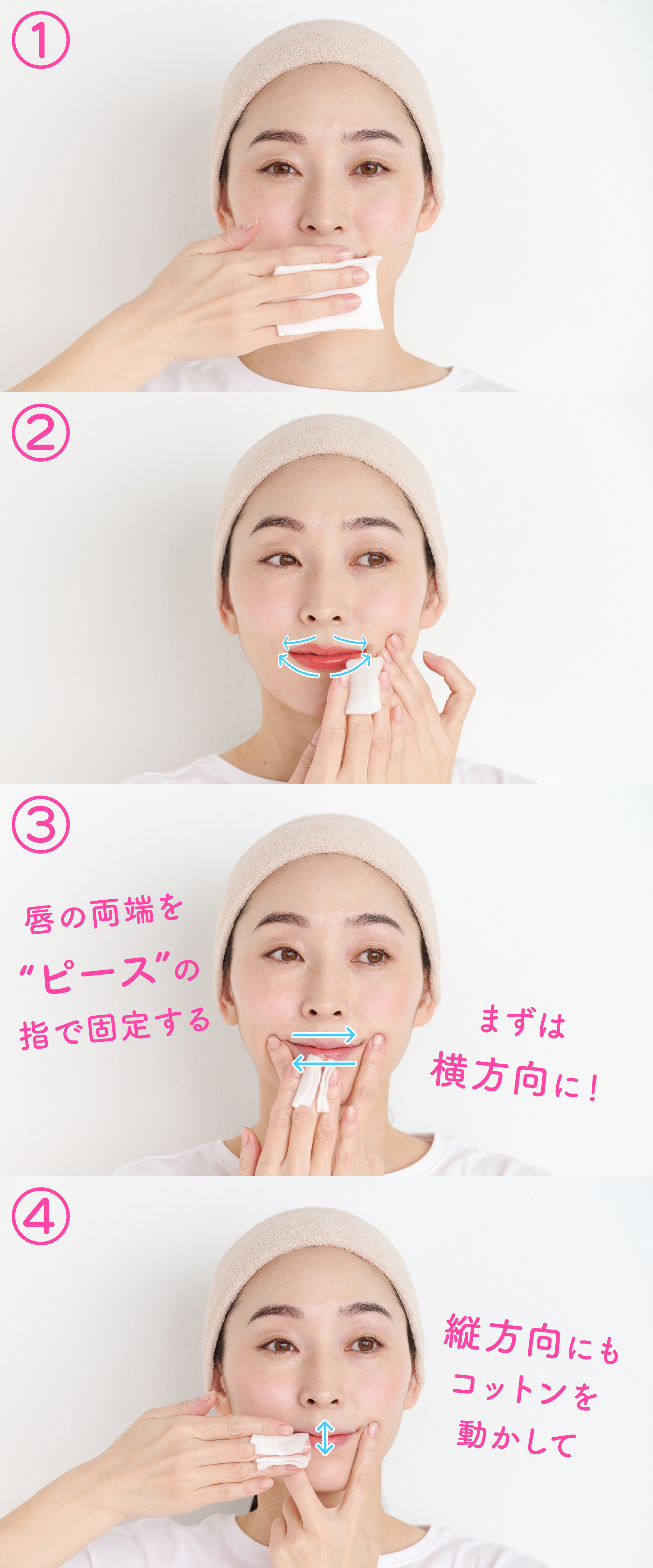 コットンを唇に10秒ほど押し当ててリップを浮かせたら、指で口角を軽く引き上げながら唇の輪郭を軽く拭き取ります。その後“ピース”の指を口角に当てて唇を固定し、まずはコットンを横方向に動かしてオフ。その後、タテ方向にもコットンを動かして唇のシワの中までしっかり落とし切る。