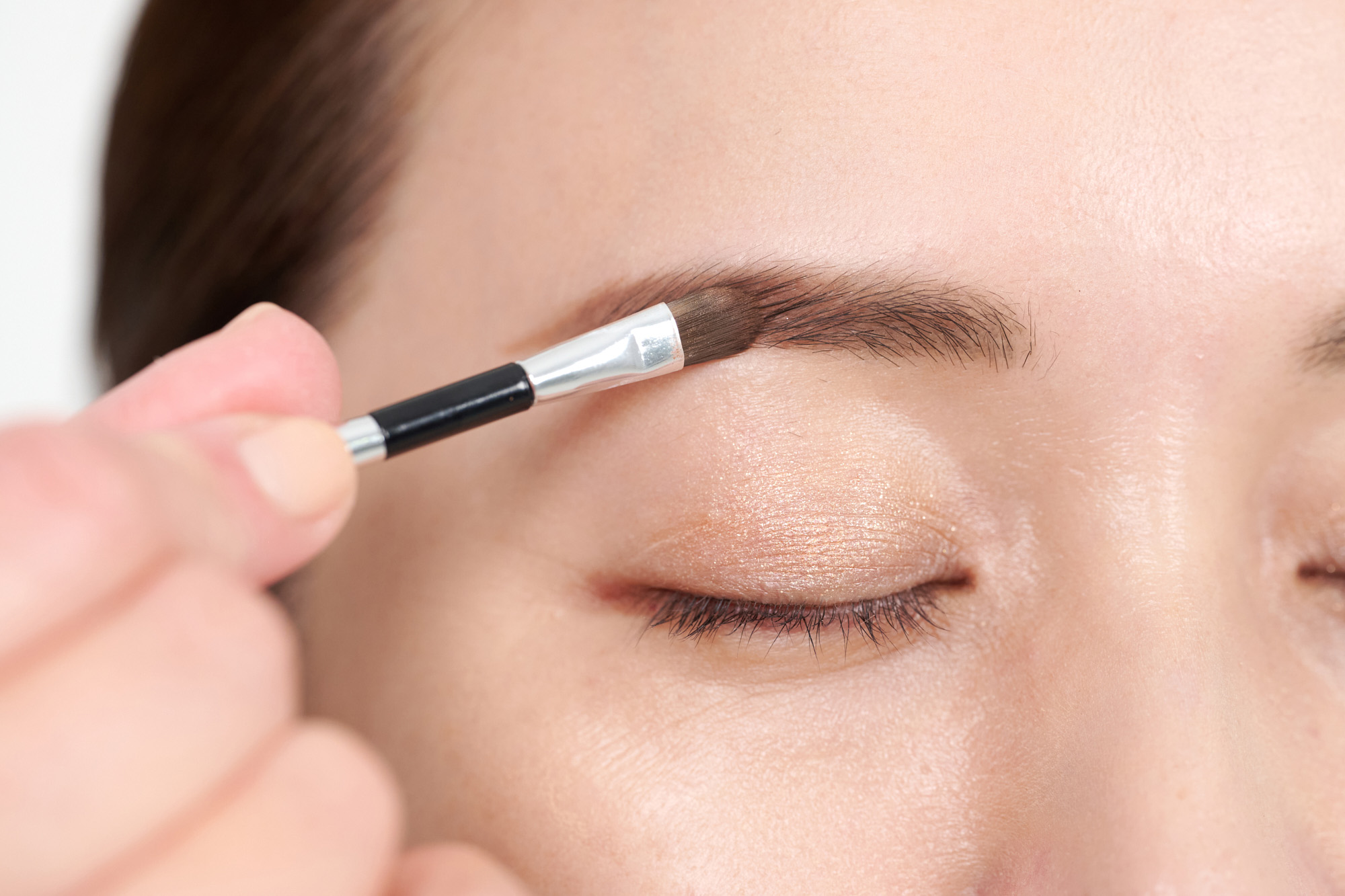 アイブロウパウダーの中央と下のカラーを大きいほうのブラシに混ぜてとり、眉の中央から眉尻にかけてのせ、最後に眉頭もふんわりと。眉頭から始めると、眉頭が強くなりすぎてしまうので、中央からスタートするのがポイントです。
